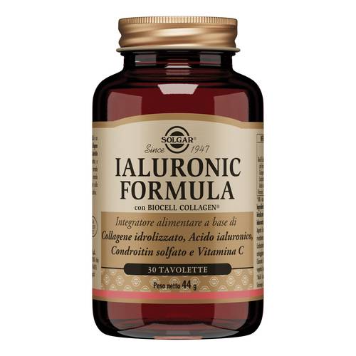 Ialuronic Formula Integratore alimentare a base di Collagene, acido ialuronico, coudroitin solfato e Vitamina C. Ingredienti Per 1 tavoletta: BioCell Collagene II 1200 mg che fornisce: collagene idrolizzato tipo II 750 mg; condroitina solfato 240 mg; acido ialuronico 120 mg; vitamina C 100 mg; agente di carica (cellulosa microcristallina) 350 mg; addensante (sodio carbossimetil cellulosa) 65 mg; colorante (biossido di titanio) 32 mg; agente di rivestimento (Idrossi propil metil cellulosa) 28 mg; antiagglomeranti (biossido di silicio, magnesio stearato vegetale) 23 mg; umidificante (glicerina) 6 mg. Modalità d'uso Deglutire 1 t...
